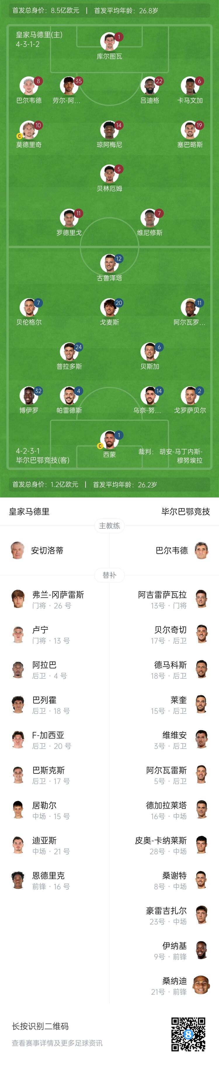 4月21日讯 西甲第32轮,皇马主场对阵毕尔巴鄂。赛前,官方公布了本场的首发名单。