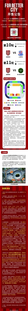 为了让球迷家人们提前规划五一假期出行和观赛,我们将[5月2日成都蓉城vs上海申花]与[5月5日成都蓉城vs浙江俱乐部绿城]这两场备受期待的比赛门票售卖时间,提前至4月30日同一天进行。以下是详细的购票须知及时间安排,请大家仔细阅读并留意: