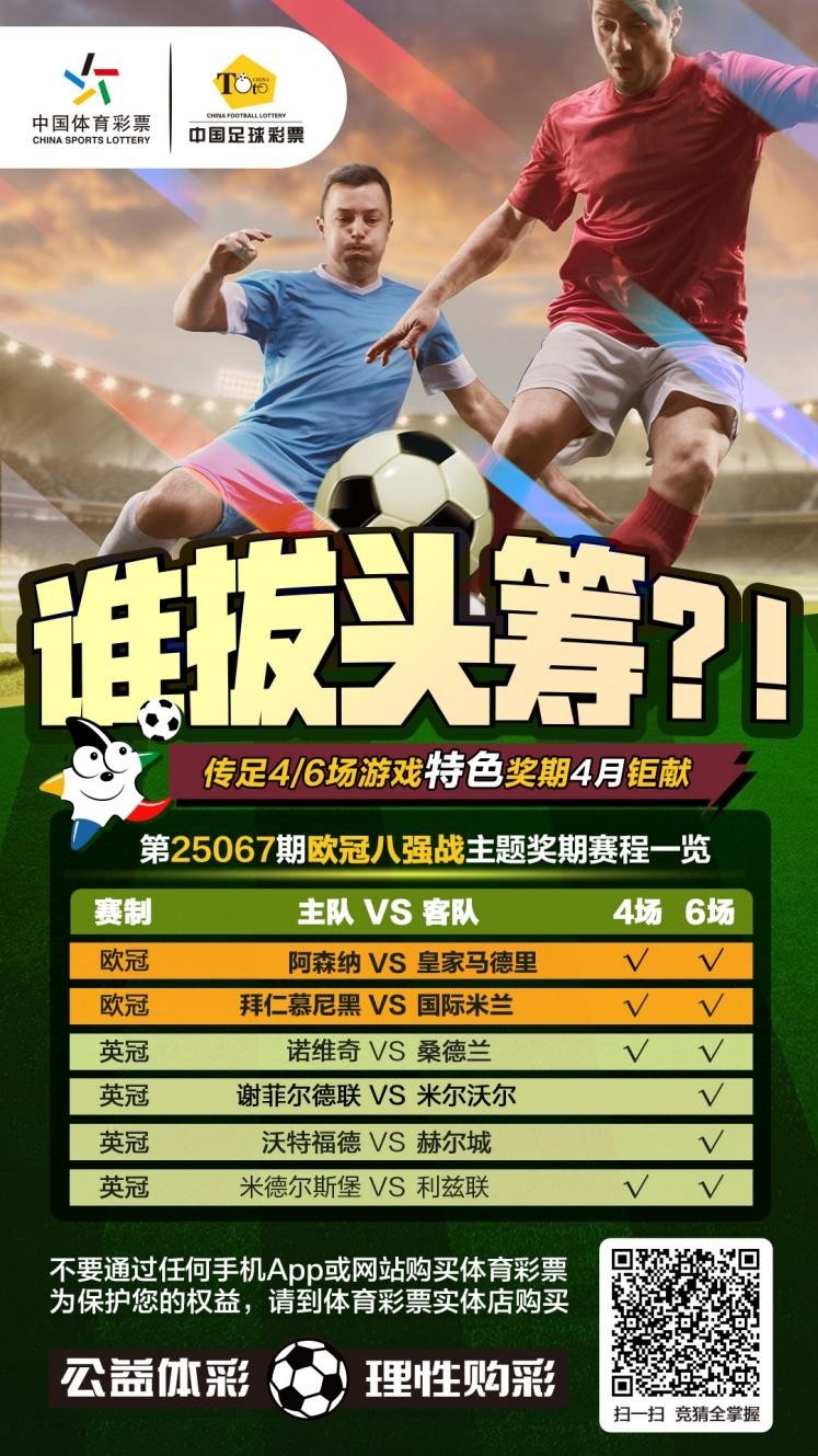 第25067期传足4/6场游戏特色奖期已经于2025年4月6日20:00开售,将于2025年4月8日22:00停售,并于4月9日开奖,其中阿森纳VS皇家马德里、拜仁慕尼黑VS国际米兰、诺维奇VS桑德兰和米德尔斯堡VS利兹联为4场进球游戏竞猜赛事。